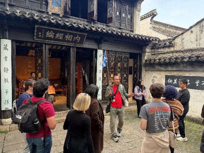 In the afternoon, the team continued their exploration into Huishan Ancient Town, known as an “open-air historical museum.” Here, over 120 ancestral halls spanning the Tang, Song, Ming, and Qing dynasties densely cluster, representing more than 80 surnames and serving as a living fossil of China's ancestral hall culture. Students freely explored representative structures like the Fan Wenzheng Ancestral Hall and Li Ancestral Hall. Through the stele inscriptions, genealogies, and architectural layouts within these halls, they gained insights into ancient Chinese clan systems, the culture of loyalty and filial piety, and social structures. Along Huishan Creek Water Street in the ancient town, students experienced the quintessential water town landscape of “small bridges, flowing water, and homes.” They sampled local delicacies like tofu pudding and twisted dough twists, immersing themselves in the unique charm of a Jiangnan ancient town.