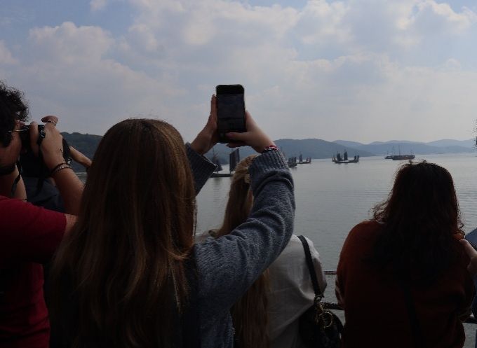 The students first arrived at Yuantouzhu, hailed as the “premier scenic spot on Lake Tai.” Its name originates from the peninsula's natural wonder, resembling a giant turtle raising its head into the lake. This place is not only a natural wonderland but also carries a thousand years of cultural heritage. Guided by the tour leader's narration, the students strolled along the lakeshore and paused before the cliff inscription bearing the words “Encompassing Wu and Yue,” contemplating the vast embrace of Taihu Lake in nurturing the Wu and Yue civilizations. The group then boarded a ferry bound for Taihu Fairy Island. As the boat glided across the emerald waters, distant mountains appeared like ink strokes against the horizon, where sky and water merged into one.